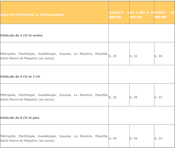 Le tarif de remboursement retenu pour les frais de déplacements :