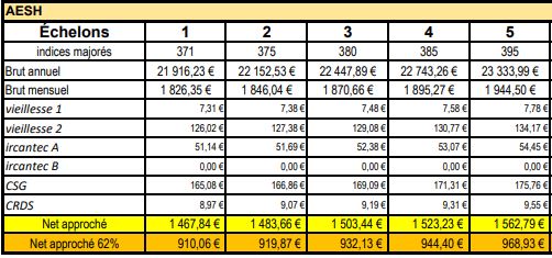Les AESH aux échelons 1 seront rémunéré.es à l’indice 371, soit 1467 € net approché mensuel pour un temps complet, 910 € net approché pour un 62%.