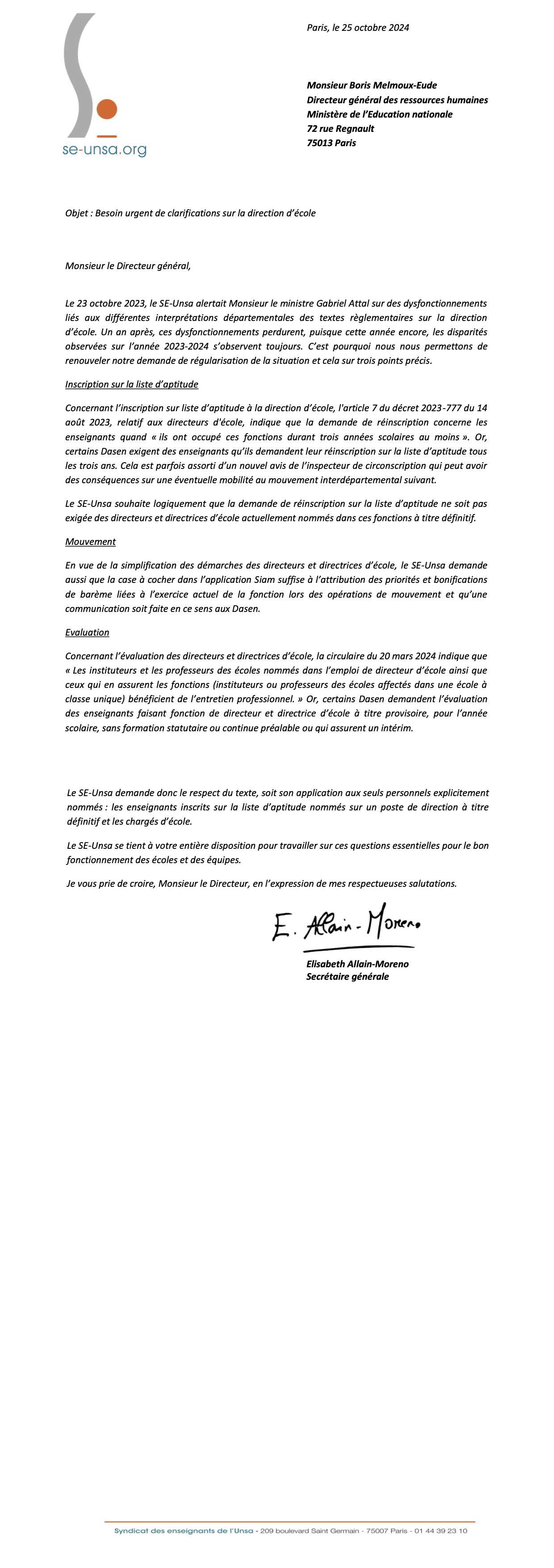 Les textes réglementaires sur la direction d’école font l’objet d’interprétations locales. Le SE-Unsa écrit au ministère pour demander de mettre fin aux iniquités naissantes. En effet, le SE-Unsa ne souhaite pas laisser s’installer ces différences de traitement et souhaite une application stricte des textes. Le SE-Unsa avait déjà alerté Gabriel Attal il y a un an sur ce risque d’inégalités.
