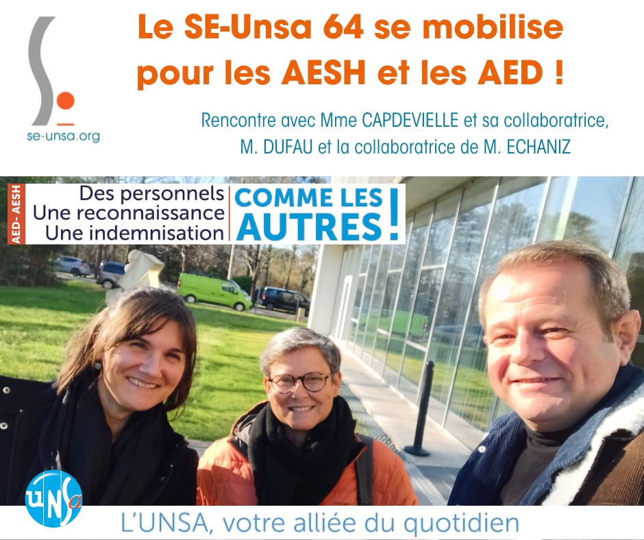 Ce lundi 20 janvier, Pierre, Nathalie et Marie-Laure ont rencontré Mme CAPDEVIELLE et sa collaboratrice, M. DUFAU et la collaboratrice de M. ECHANIZ pour évoquer la situation des AESH et AED.