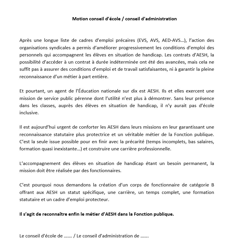 Les AESH constituent le deuxième métier de l’Éducation nationale en nombre de personnels mais ils et elles ne sont toujours pas reconnu·es et leurs salaires sont toujours aussi bas. Pourtant, l’accompagnement des élèves en situation de handicap est une mission essentielle et pérenne de l’École. C’est un véritable métier avec des compétences professionnelles spécifiques pour faire réussir les élèves et qui relève ainsi d’un véritable statut.