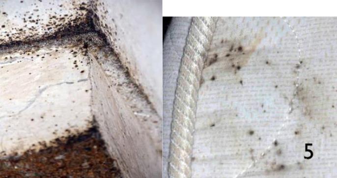 Les punaises de lit déposent leurs déjections à l’extérieur de leur cachette. C’est un élément important car très visibles sous forme de petits points noirs, en fait du sang digéré. Au niveau du matelas, c’est généralement sur les coutures (fig. 0), sur les sommiers à lattes c’est au niveau de l’insertion des lattes ; sur des plinthes c’est à l’endroit du décollement (fig. 0). On peut trouver aussi de petites taches de sang frais sur les draps causés par l’écrasement d’une punaise dans le sommeil
