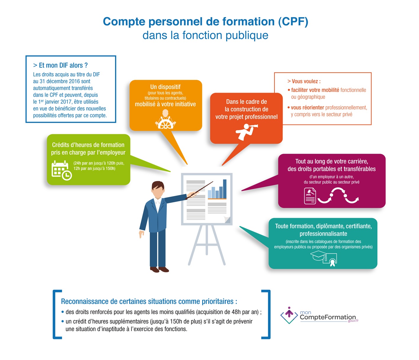 Le compte personnel de formation est un crédit d’heures qui peut être mobilisé pour suivre une formation permettant de mettre en œuvre un projet d’évolution professionnelle. Il concerne l’ensemble des agents de l’académie ainsi que les personnels de la DRAJES rattachés à l’éducation nationale. Sont éligibles les agents titulaires comme les agents contractuels à contrat à durée indéterminée ou déterminée quelle que soit la durée du contrat, sans que soit exigée une durée minimale d’exercice des fonctions.