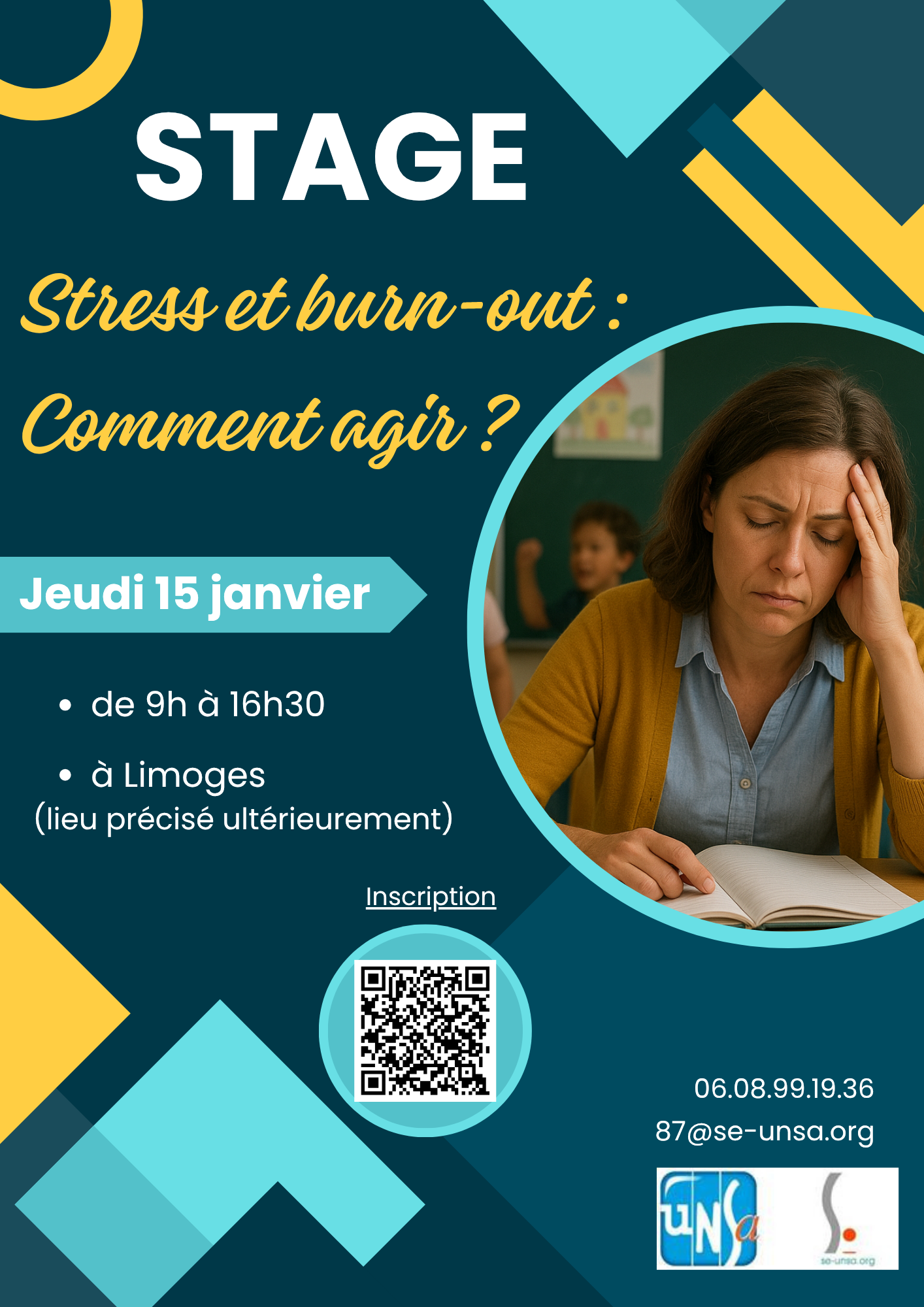 Le stress et le burn-out touchent de plus en plus de personnes dans le quotidien professionnel et personnel. Pour aider chacun à mieux les comprendre et à les prévenir, le SE-Unsa 87 organise un stage le jeudi 15 janvier, animé par un formateur national.
