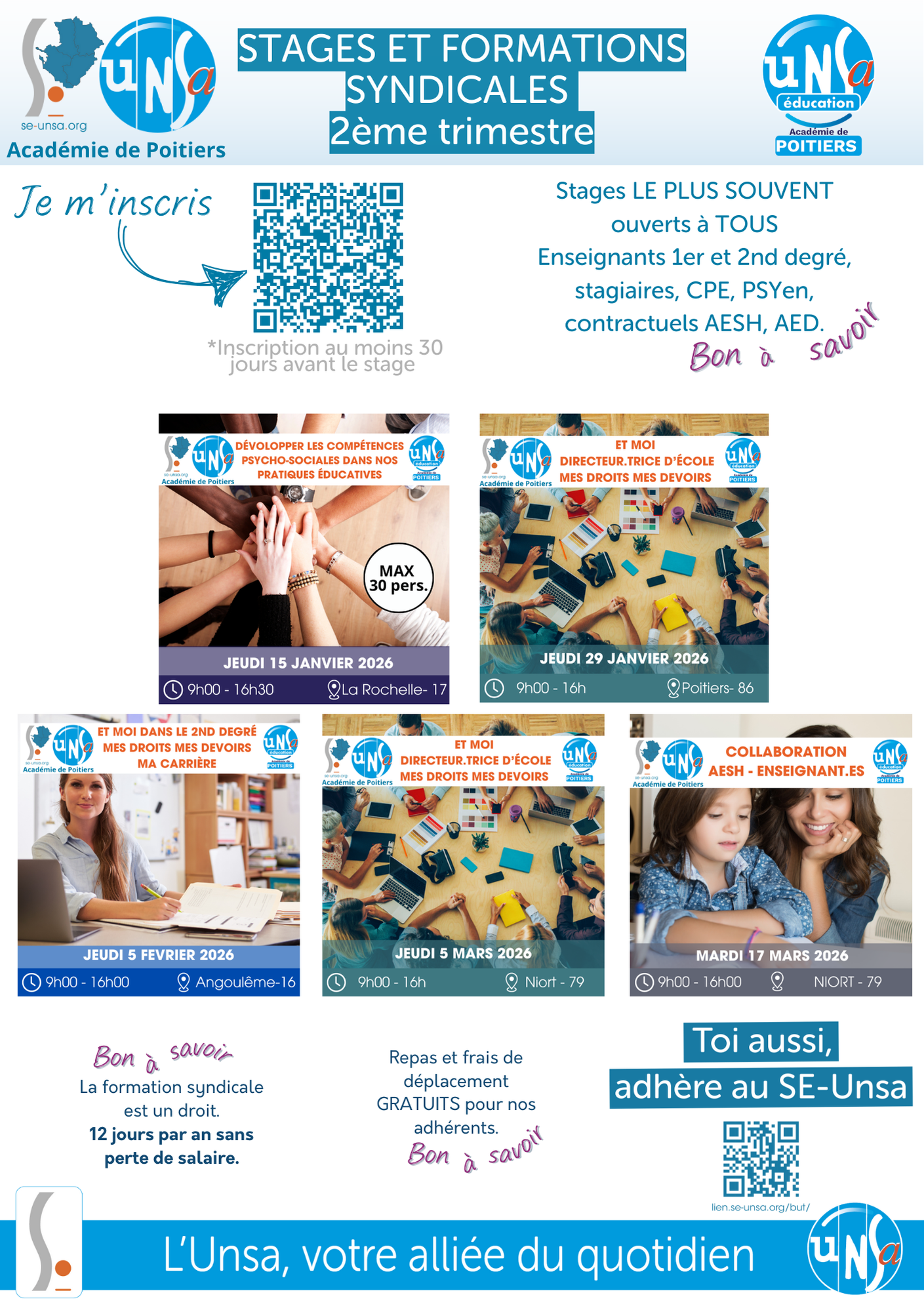 Ouverture des inscriptions aux stages et formations de janvier à mars 2026 SE-Unsa Académie de Poitiers