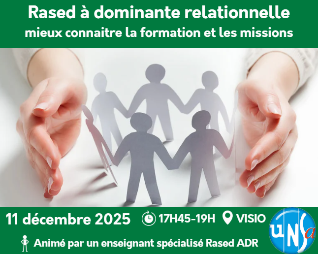 Le SE-Unsa organise, avec la participation d’enseignants spécialisés membres de l’AREN 28, une visio pour mieux comprendre les missions des RASED à dominante relationnelle ainsi que la formation.