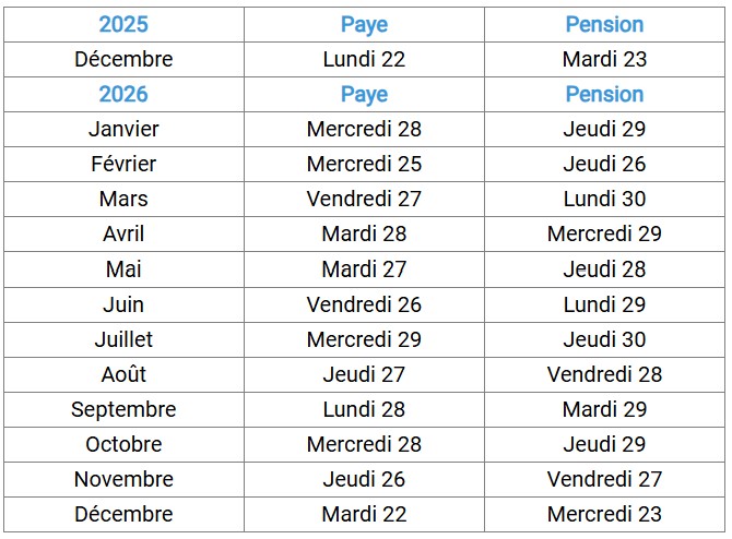 Vous trouverez ci-dessous le calendrier prévisionnel de la mise en paiement des payes et des pensions des agents publics de l’État pour 2026.