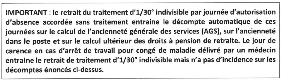 Il est possible d’envoyer les pièces justificatives dans un délai maximum de 2 jours. L’absence de ces pièces justificatives, en cas de maintien de traitement accordé lors de la demande d’autorisation d’absence, entrainera un retrait sur salaire équivalent à une journée d’absence (1/30ème indivisible).