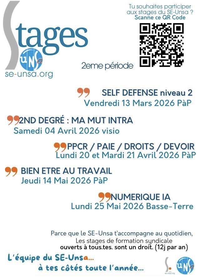 La seconde période de stages du SE-Unsa Guadeloupe te propose une nouvelle série de thématiques pour poursuivre ton accompagnement tout au long de l’année. Pour participer à la formation de ton choix, il te suffit de compléter le formulaire ci-dessous. Nous serons heureux de t’y accueillir.