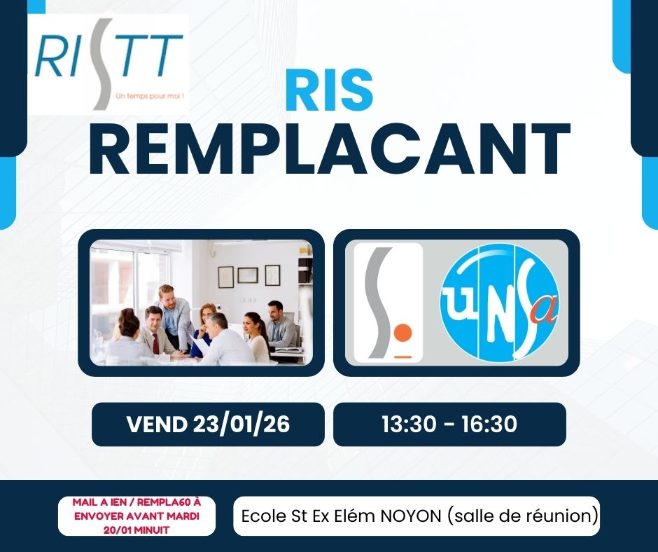 RIS spécial remplaçants le vendredi 23 janvier 2026 Ecole Elémentaire Noyon (salle de réunion) 13h30 à 16h30