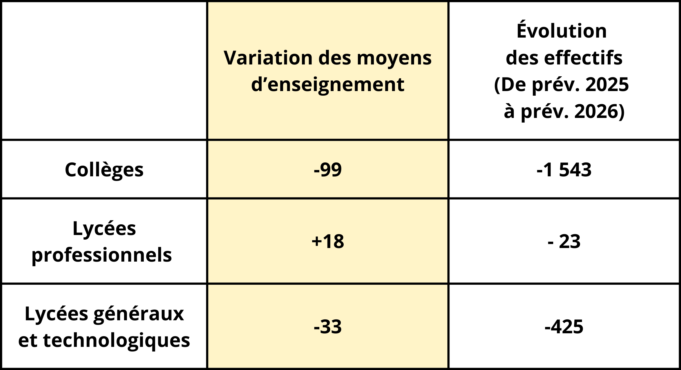 Une perte de 1 991 élèves est prévue pour la rentrée prochaine au niveau académique dans le second degré. Une baisse de 100 postes est actée pour la rentrée prochaine qui se répartit comme suit :