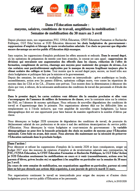Appel national intersyndical à une semaine de mobilisation dans l’Éducation nationale : moyens, salaires, conditions de travail, amplifions la mobilisation !