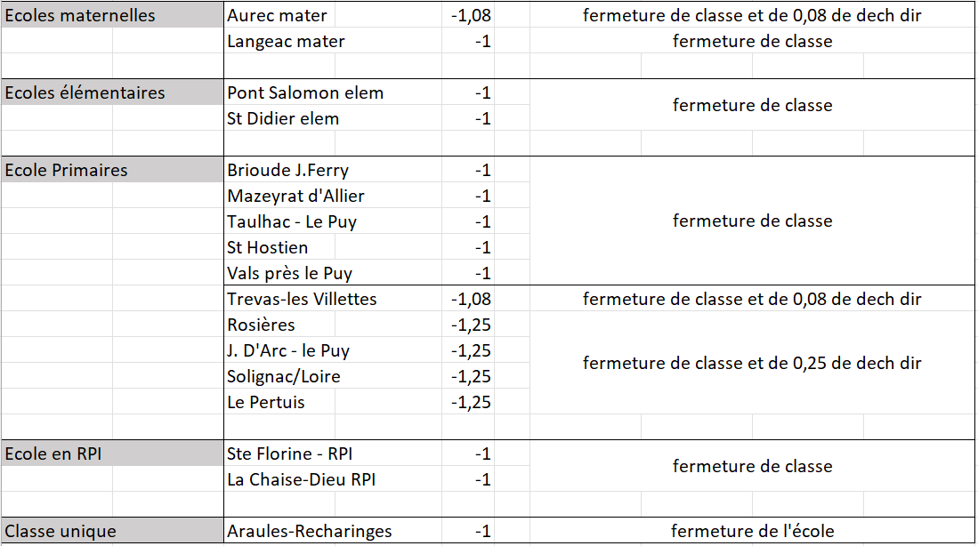 A l’issue des débats, l’Inspecteur d’académie a proposé de retirer deux écoles de la liste des potentielles fermetures : Langeac maternelle et l’école primaire de Taulhac au Puy en Velay.