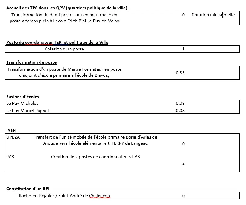 L’inspecteur d’académie pourrait également envisager de mettre un moyen supplémentaire à l’année sur les écoles d’Aiguilhe, Coubon et Saint Christophe sur Dolaizon, mais aucune décision en ce sens n’a été actée.