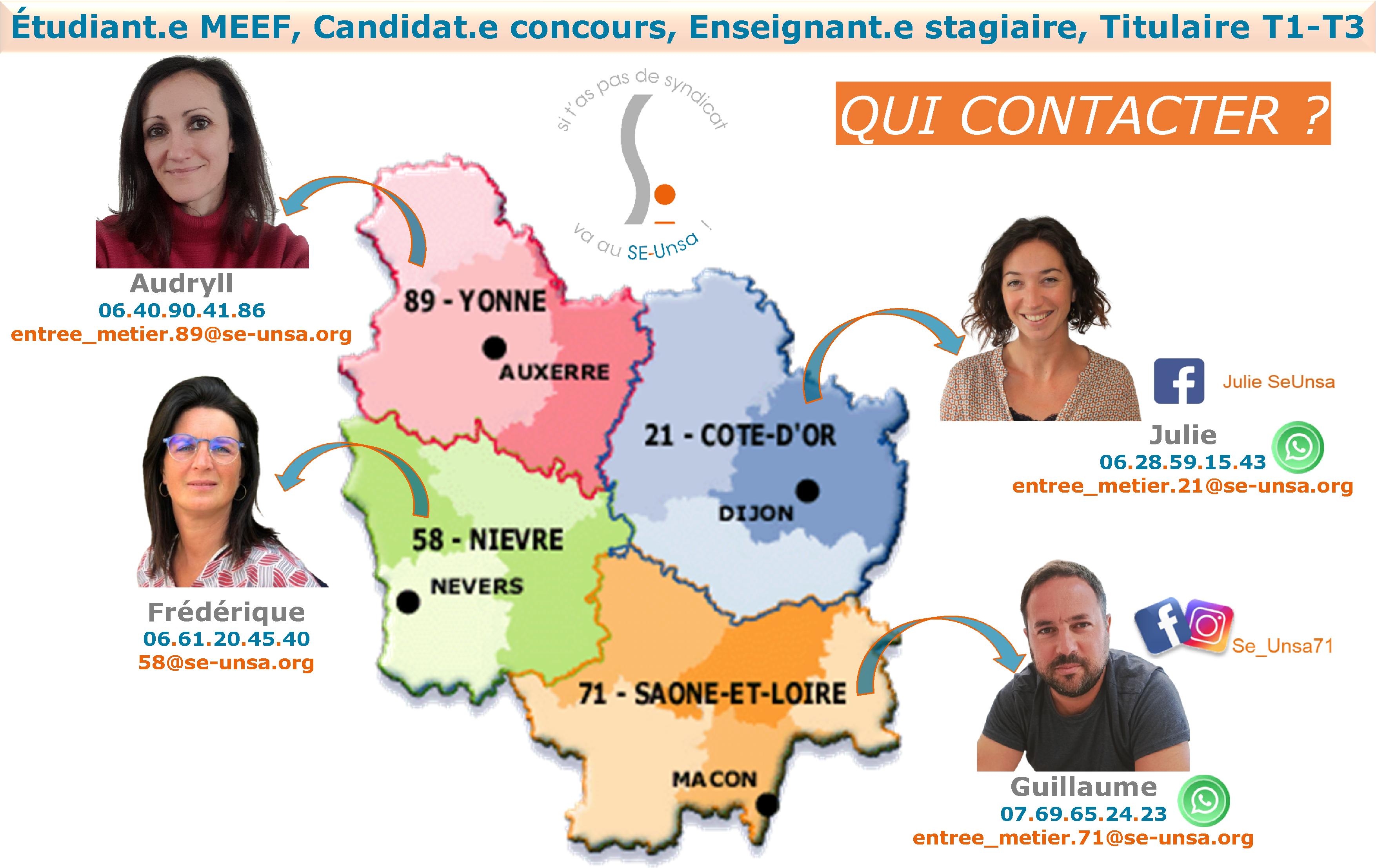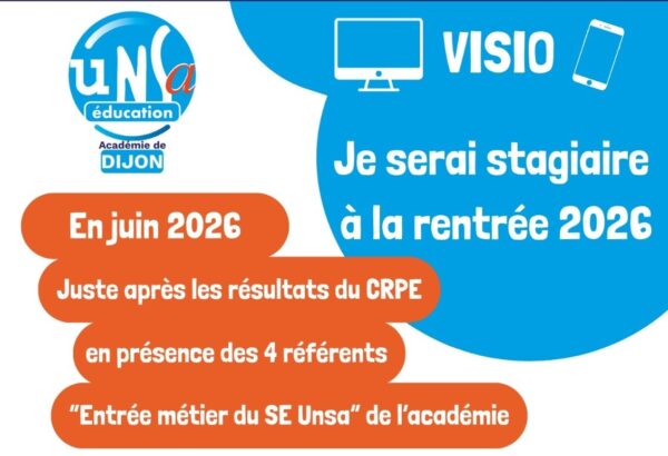 À toutes ces questions – et à bien d’autres – que chaque (futur) lauréat se pose déjà ou se posera dès la parution des résultats d’admission en juin, nous y répondrons dès le lendemain lors d’une visio, en présence des référents « Entrée métier » du SE-Unsa des 4 départements de l’académie de Dijon !