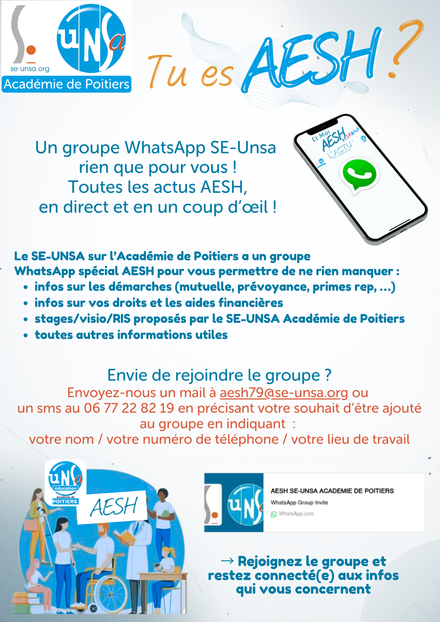 Vous êtes AESH dans l'Académie de Poitiers et vous souhaitez recevoir des informations sur votre métier, vos droits et devoirs... ? Le SE-Unsa vous propose de faire partie d'un groupe WhatsApp.