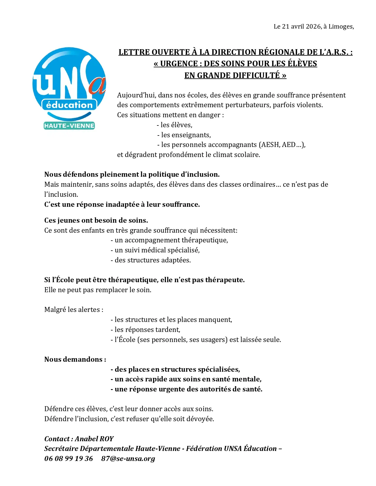 [87 – 1D] L’UNSA Education 87 adresse une Lettre Ouverte à l’Agence Régionale de Santé
