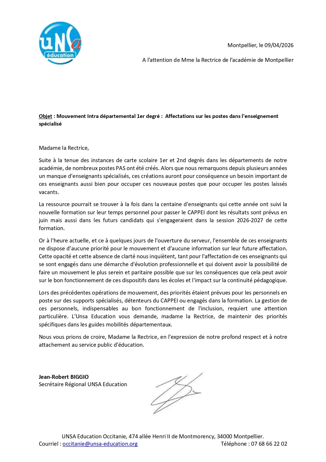 A seulement quelques jours de l’ouverture du serveur pour le Mouvement intra départemental dans le 1er degré pour l’ensemble de notre académie, les enseignants engagés dans la nouvelle formation CAPPEI cette année scolaire 2025-2026 ou bien les futurs candidats à la formation l’année prochaine n’ont aucune information concernant leurs futures priorités sur les postes dans l’enseignement spécialisé. L’Unsa éducation a donc écrit ce jour à Madame la Rectrice pour l’alerter et demander les priorités soient mises en place comme elles existaient les années précédentes.