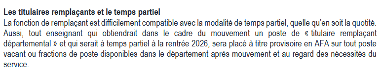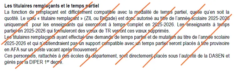 Les enseignants ayant fait une demande de temps partiel pour l’année scolaire 2026-2027 pourront donc postuler sur les postes de titulaires remplaçants départementaux sans que leurs vœux ne soit barrés.