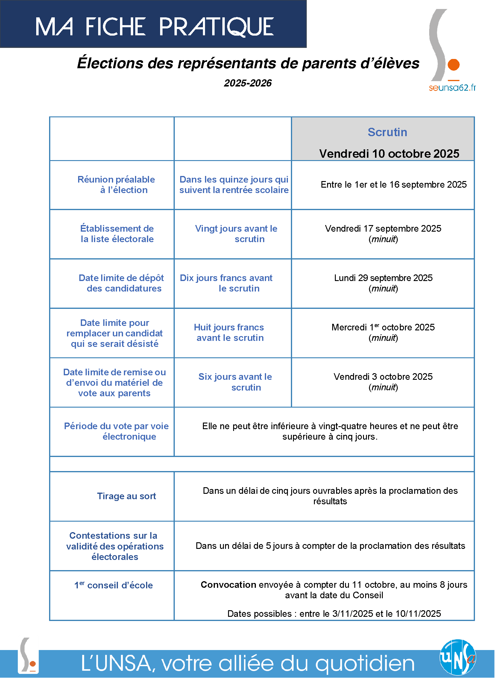 Toutes les étapes et dates concernant les élections de parents d’élèves, en un clic en téléchargeant notre fiche pratique : Je télécharge la fiche pratique